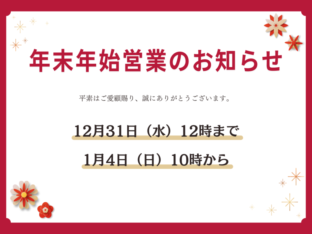 2025年11月28日 お知らせ 年末年始の営業のお知らせ 当院の年末年始の営業は以下の通りです。 年末:12月31日(水) 営業12時まで 年始:1月4日(日) 受付10時開始 当院は予約制となっております。事前にご予約いただきますようお願いいたします。